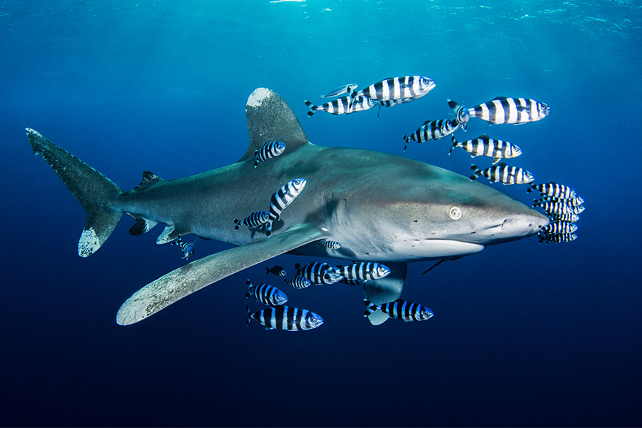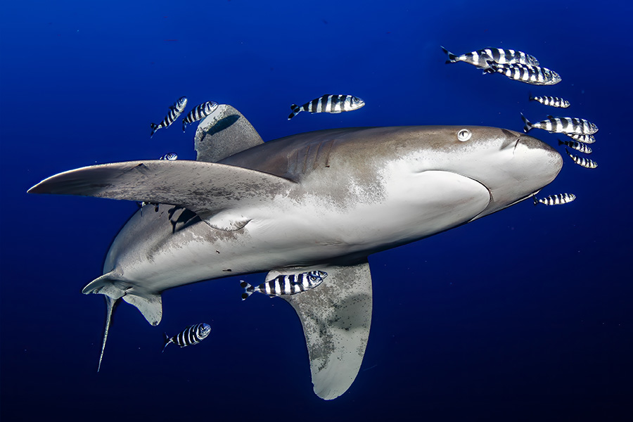 Der Longimanus, oder Oceanic Whitetip Shark, ist ein wahrer Herrscher der offenen Ozeane und für seine langen, eleganten Flossen bekannt. Besonders beeindruckend sind Begegnungen auf Hochseetauchgängen, wenn er langsam und majestätisch durch das Wasser gleitet. Ein Grossfisch, der Kraft, Eleganz und die geheimnisvolle Welt der Tiefsee verkörpert.