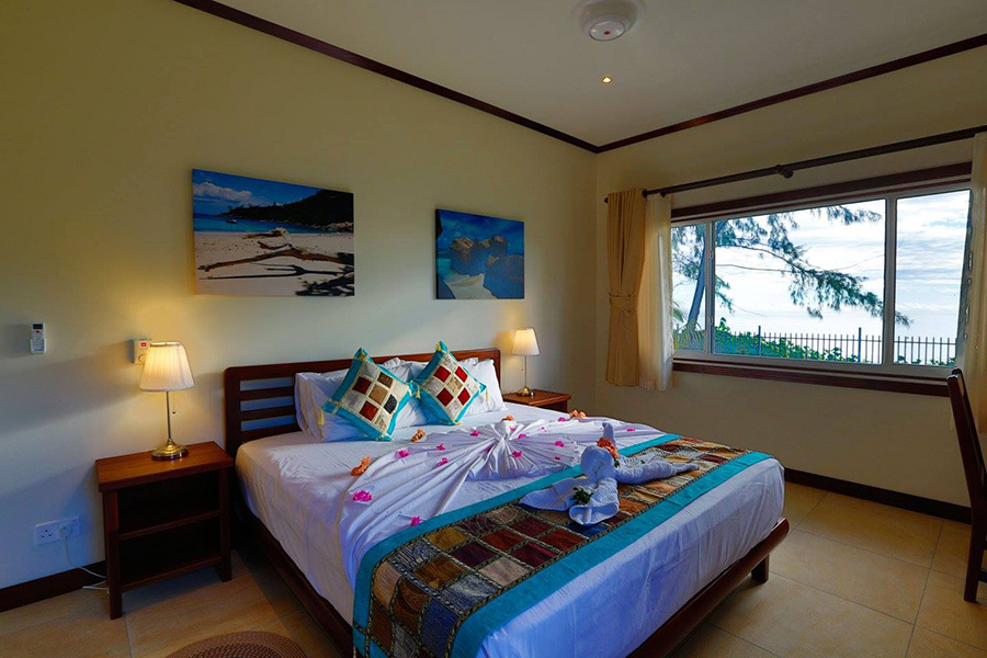 Die kleine Anlage befindet sich an der Nordostküste Praslins im Ort Cote d’Or, direkt am Sandstrand Anse Volbert. Praslin erreicht man von Mahé aus per Inlandflug (etwa 20 Minuten) oder per Fähre (etwa 45 Minuten). Der Transfer vom Flughafen Praslin zum Hotel dauert ungefähr 20 Minuten.