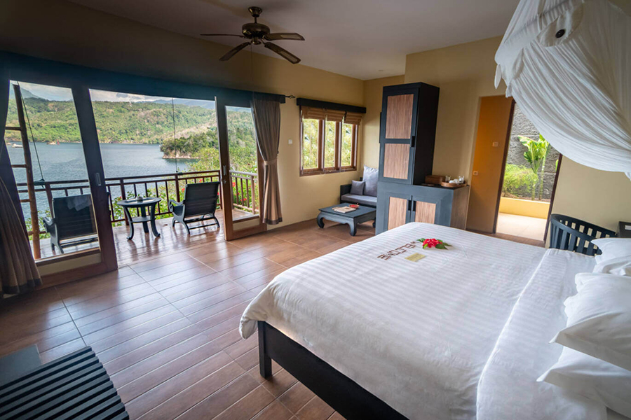Die Garden View Zimmer sind in einem Gebäude in der Nähe des Restaurants und der Tauchbasis und umgeben von einem tropischen Garten. Die Premium Luxury Cottages befinden sich im grünen eingebettet leicht erhöht vom Meer oder erhöht am Hang mit Meerblick. Die luxuriöse Cliffside Villa ist ebenfalls am Hang gebaut direkt oberhalb der Bucht. Die Villa bietet zusätzlich eine Wohnzimmer, Espresso-Maschine, ein Flatscreen-TV, Tisch und eine grosse Terrasse mit eigenem Pool.
