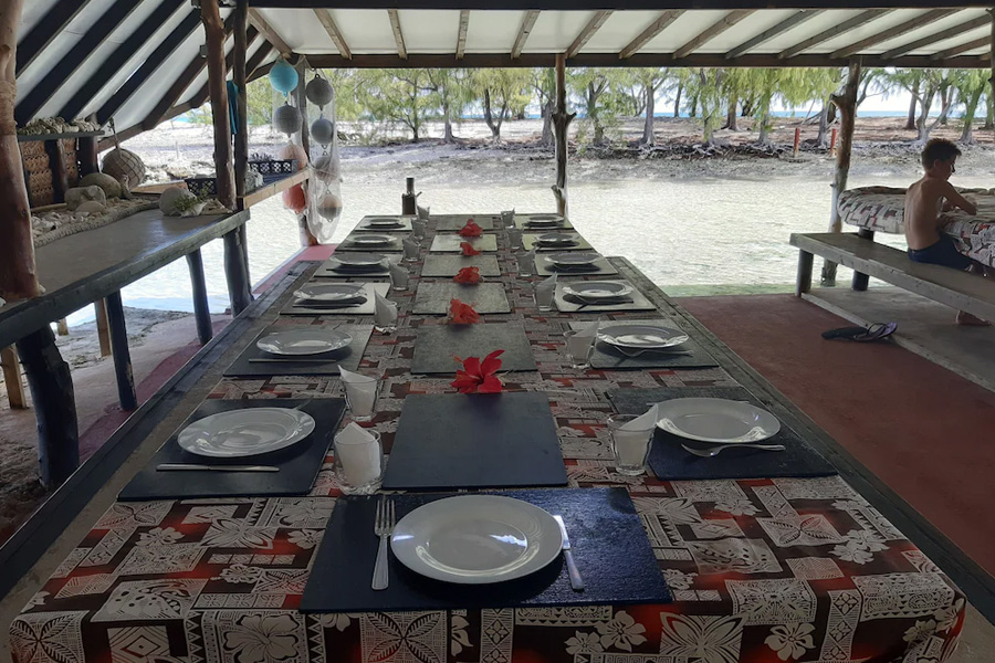 Das direkt am Wasser liegende Restaurant serviert alle Mahlzeiten am Tisch. Das Mittags- und Abendessen besteht meisten aus frischen Meerestieren, jedoch werden immer wieder einmal internationale Gerichte gekocht. Die Pension serviert keinen Alkohol, dieser darf jedoch selbst mitgebracht werden. Verschiedene kleine Tagesausflüge werden von der Pension angeboten. Tradition, Authentizität und polynesisches Erbe sind die Grundwerte der Pension. Zusätzlich wird die nachhaltige Entwicklungsstrategie gestärkt. Die Anlage verfügt über Sonnenkollektoren und hat eine Mülltrennungspolitik eingeführt. Zudem unterstützen sie die Einheimischen mit Auffangtanks für Regenwasser und mit einem Catering-Service, um der Gemeinde ökologischen und natürlichen Produkte ohne Plastikverpackungen zu liefern. Chemische Reinigungsmittel werden nicht eingesetzt, ökologische und natürliche Produkte sind bevorzugt.