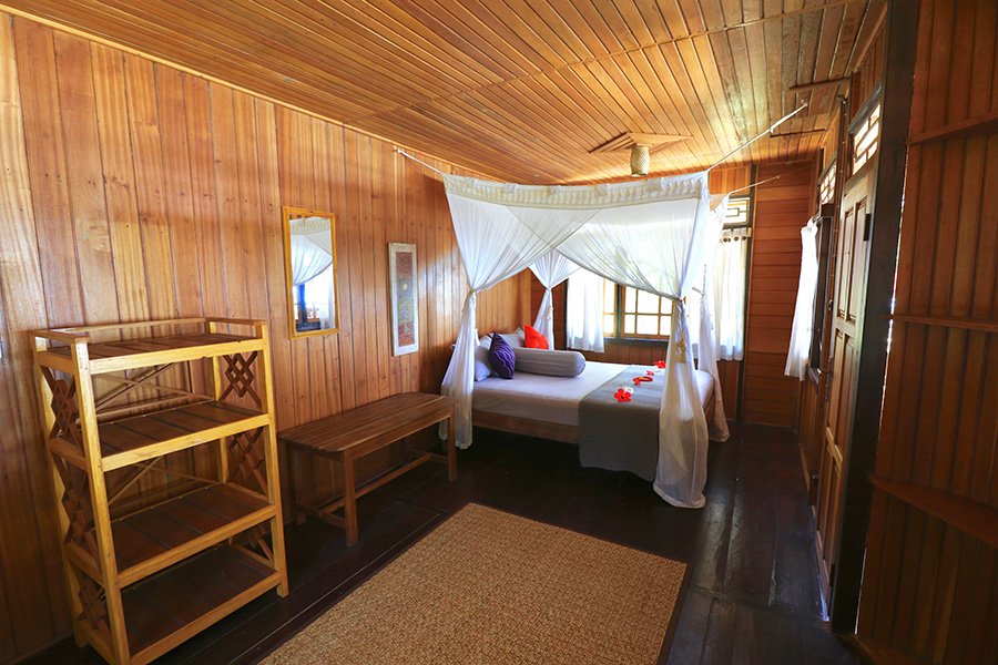 Im Resort gibt es Deluxe Bungalows, welche am Strand gelegen sind und verfügen über eine Veranda eine Dusche und Sitztoilette. Die vier Budget Bungalows sind weiter hinten. Unter einem Dach und durch eine Wand getrennt befinden sich zwei Einheiten. Jede davon hat einen eigenen, privaten Eingang, eine Veranda, ein indonesisches Mandi ( Waschbecken und Eimer), Sitztoiletten und ein Doppelbett.