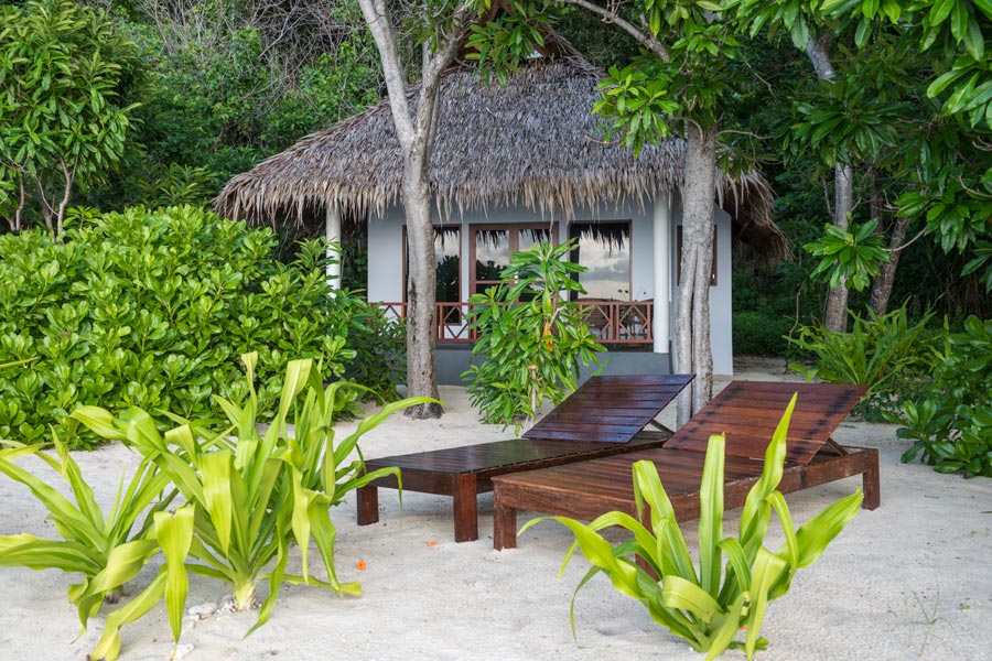 Den Gästen stehen sieben grosszügige Bungalows und eine Beach Villa direkt am Strand zur Verfügung. Alle Zimmer sind ausgestattet mit Bad/WC, Ventilator, Minibar und eine eigene Terrasse mit Meerblick. Zudem hat jede Wohneinheit einen eigenen Strandabschnitt mit zwei Liegestühlen. Die neueren und grösseren Beach Villen sind aus Stein gebaut und verfügen zusätzlich über eine Klimaanlage und ein Tagesbett.