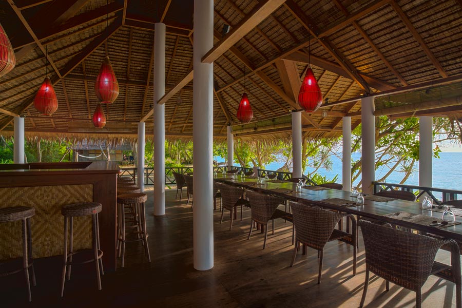 Direkt am Strand befindet sich das kleine Restaurant, in dem schmackhafte asiatische und internationale Gerichte angeboten werden. Zum Frühstück wird selbst gebackenes dunkles Brot aufgetischt, zum Mittagessen gibt es leichte, vegetarische Gerichte und am Abend wird ein leckeres Drei-Gänge-Menu serviert. Am Sandstrand oder in der Lounge auf dem Steg können die Gäste zwischen den Tauchgängen relaxen. Ausflüge in die nähere Umgebung werden gerne organisiert.