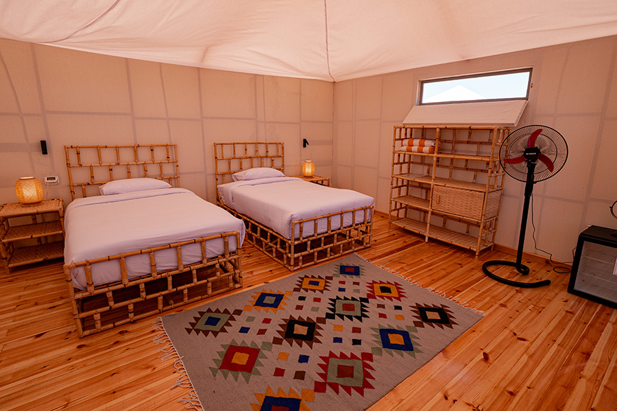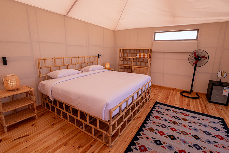 Die Royal-Beduinenzelte (5 x 5 Meter) sind mit einem Doppelbett oder zwei Einzelbetten ausgestattet und bieten Ventilator, Minibar, Sitzkissen sowie eine kleine Sitzecke vor dem Zelt – mit Blick aufs Meer. Das Gemeinschaftsbad mit Dusche und WC wird von allen Gästen der Zelte gemeinsam genutzt.