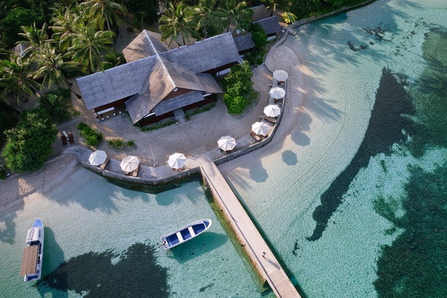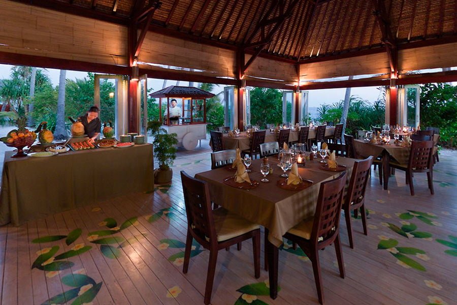 Das Resort liegt direkt an einem weissen Sandstrand. Im Haupthaus mit Meerblick befinden sich das offene Restaurant, die Tauchbasis und die Rezeption. Zudem gibt es einen Spa, eine Bibliothek, ein Medienzimmer, ein Shop und die Langhouse Lounge. Gegen Aufpreis wird ein Nanny Service angeboten und es gibt einen Kids Club. Das Restaurant bietet eine abwechslungsreiche Küche mit frischen Produkten welche als Buffet serviert werden. An der Sunset Jetty Bar, welche am Ende des eigenen Steges liegt, gibt es Getränke und Snacks.