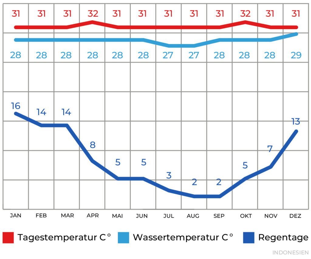 Indonesien hat ein tropisches und feuchtes Klima und kann das ganze Jahr über bereist werden. Als generelle beste Reisezeit gelten für die westlich gelegenen Inseln (u.a. Bali, Alor, Komodo) die Monate April bis Oktober und für die östlich gelegenen Inseln (u.a. Raja Ampat, Molukken) Oktober bis April. Aufgrund der Grösse des Landes und den taucherischen Highlights in den einzelnen Regionen können andere Empfehlungen gelten. In der Regenzeit können die Sichtweiten unter Wasser beeinträchtigt werden. Die Temperaturen liegen das ganze Jahr über bei 30°C und die Wassertemperaturen bei 28°C. Ein 3mm-Nasstauchanzug oder ein Shorty reicht in der Regel aus. Bei Komodo und Alor gibt es Tauchplätze mit kühleren Wassertemperaturen, hier ist ein 5mm-Nasstauchanzug mit Überzieher oder ein 7mm-Nasstauchanzug zu empfehlen.