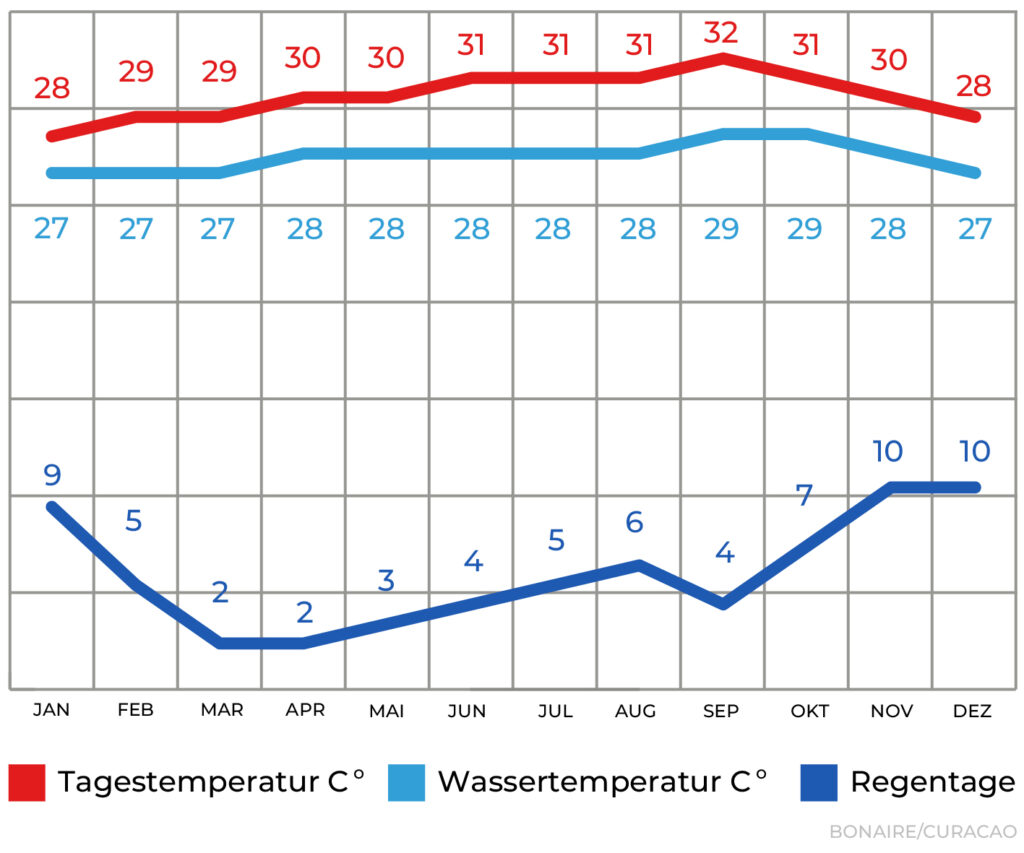Die ABC-Inseln haben ganzjährig ein gemässigtes Klima und sind immer gut zu bereisen. Der Winter gilt als Hochsaison. Wegen der Nähe zum südamerikanischen Kontinent bleiben die Inseln von tropischen Wirbelstürmen (Hurricanes) verschont. Über das ganze Jahr verteilt fallen immer wieder kurze Regenschauer, eine eigentliche Regenzeit gibt es aber nicht. Die Temperaturen liegen durchschnittlich bei 30°C und die Wassertemperaturen bei 28°C. In der Regel reicht ein 3mm Nasstauchanzug oder ein Shorty.