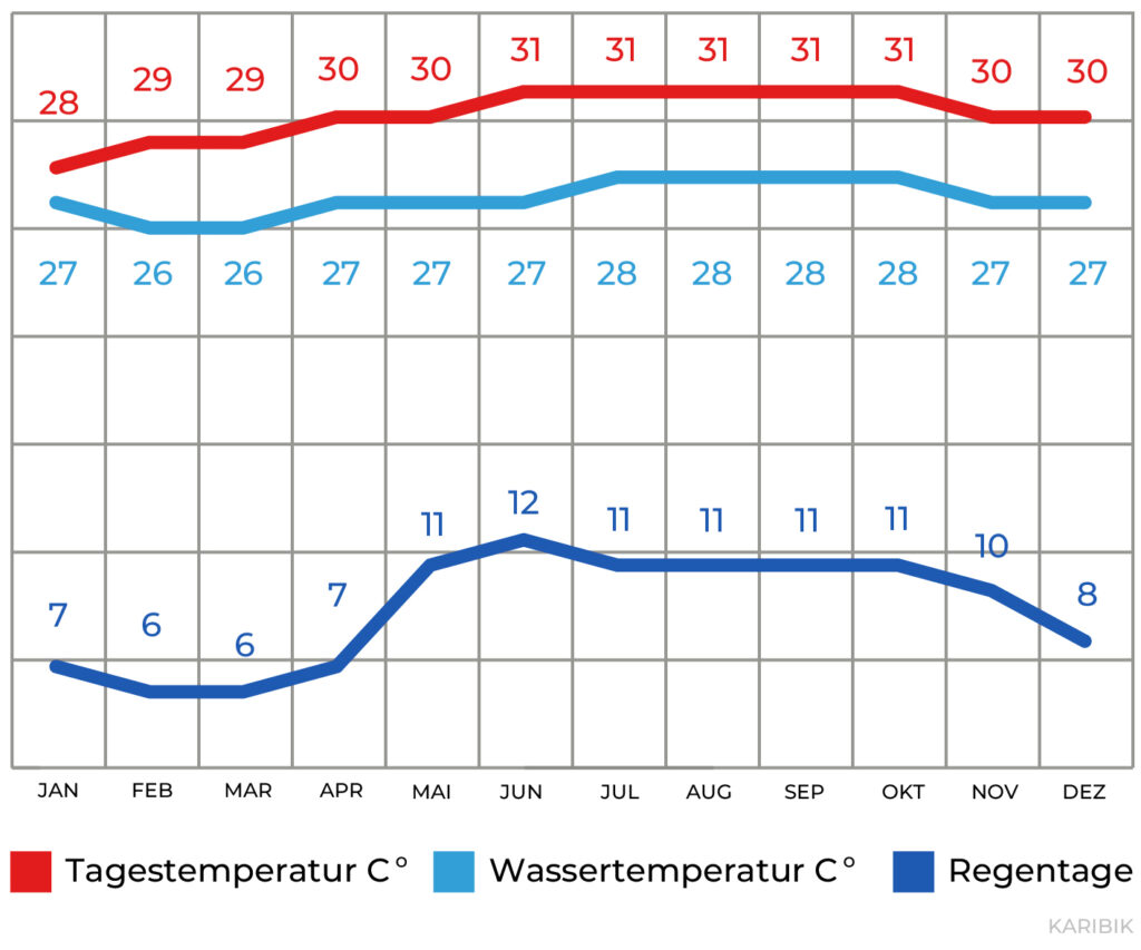 Das Klima auf den Cayman Inseln ist ganzjährig tropisch warm. Die Regenzeit ist von Mai bis Oktober. Schauer, die während dieser Zeit auftreten, sind meist kurz und heftig. Von August bis Oktober können tropische Wirbelstürme (Hurricanes) auftreten. Die Temperaturen liegen zwischen 28°C bis 32°C und die Wassertemperaturen zwischen 26°C und 28°C. In der Regel reicht ein Shorty oder ein 5mm-Nasstauchanzug.
