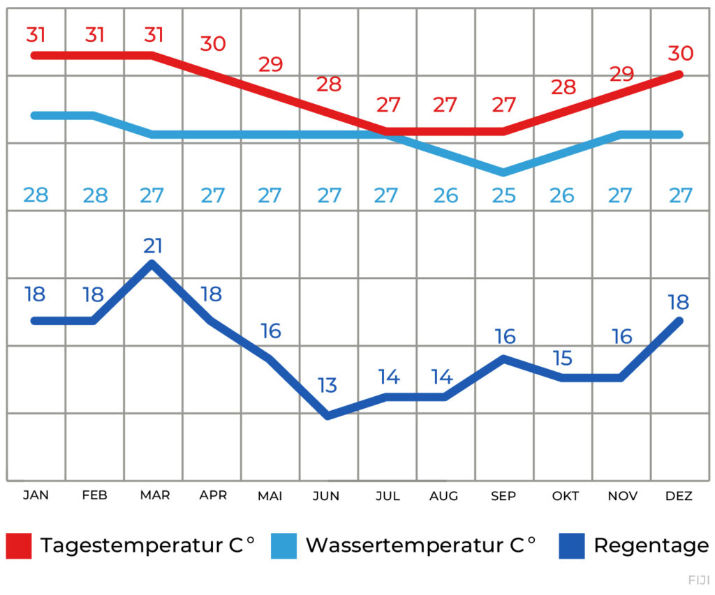 Die Fiji-Inseln können dank des tropischen Klimas das ganze Jahr bereist werden. Von April bis Oktober gibt es die besten Sichtweiten unter Wasser. Von Dezember bis Februar fallen die meisten Niederschläge. In dieser Zeit können auch tropische Wirbelstürme auftreten. Die Temperaturen liegen das ganze Jahr über bei 25°C bis 31°C und die Wassertemperaturen bei 25°C bis 28°C. Je nach Saison reicht ein Shorty, ein 3mm- oder 5mm-Nasstauchanzug.