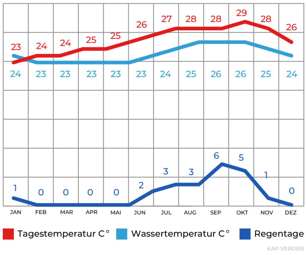 Dank des warmen und trockenem Klima können die Kap Verden das ganze Jahr über bereist werden. Strömungs- und windbedingt ist die beste Reisezeit für Taucher und Schnorchler von Juni bis November. Für Surfer und Kiter ist wind- und wellenbedingt die beste Reisezeit von November bis Mai. Die Regenfälle unterscheiden sich von Insel zu Insel sehr. Auf den trockenen, felsigen Inseln wie Sal oder Boa Vista regnet es sehr selten. Wohingegen es auf den tropischeren Inseln wie Santo Antao oder São Vicente mehr zu Regenfällen kommt. Santiago ist eine Mischung aus beiden. Die Tagestemperaturen liegen das ganze Jahr zwischen 23°C und 30°C. Der meiste Niederschlag fällt zwischen August und November. Die Wassertemperaturen sind bei angenehmen 22°C bis 27°C. Je nach Jahreszeit reicht ein 3mm- bis 5mm-Nasstauchanzug.