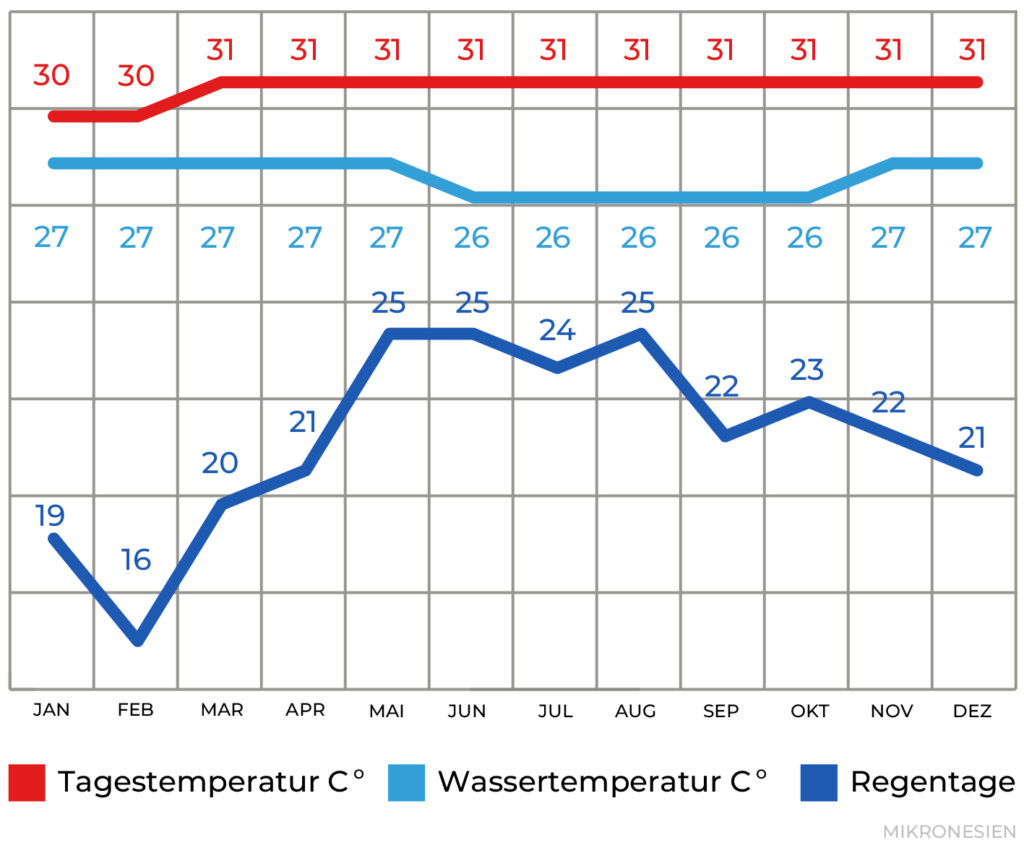 Die beste Reisezeit für Mikronesien ist von November bis April. Das tropisch-feuchte Klima bringt das ganze Jahr immer wieder Niederschläge. Am meisten Regen fällt von Mai bis Oktober. Aufgrund der Lage werden die meisten Inseln von tropischen Wirbelstürmen verschont, es kann jedoch immer mal vorkommen, dass ein Sturm die Inseln streift. Die Temperaturen liegen das ganze Jahr über bei 28°C bis 30°C und die Wassertemperaturen bei 26°C bis 28°C. In der Regel reicht ein 3mm- oder 5mm-Nasstauchanzug.