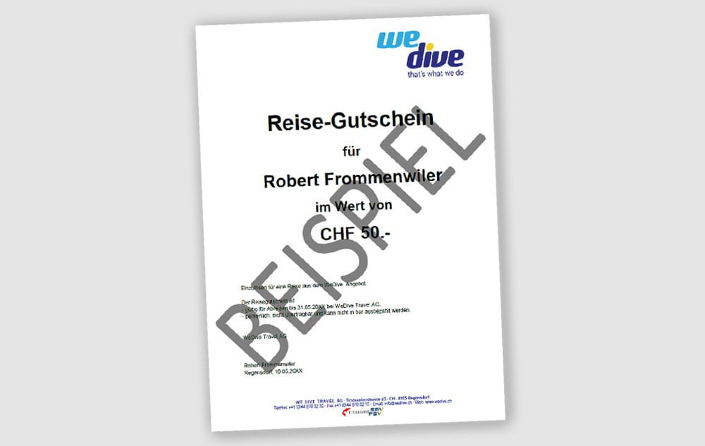Bestelle in unserem Shop unseren aktuellen Katalog «Worldwide Adventures», Geschenkgutscheine und unser WeDive-Logbuch. Kaufe ein WeDive-Bandana und wir Spenden die Hälfte des Betrages an eine Non-Profit-Gesellschaft die sich zum Erhalt der Unterwasserwelt einsetzt.