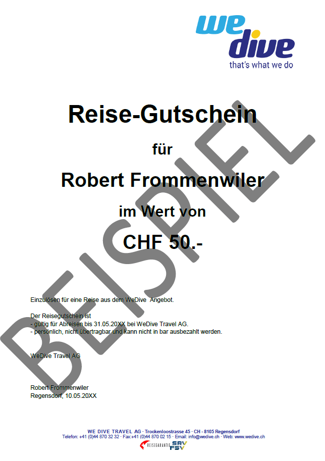 Da unsere Gutscheine persönlich und nicht übertragbar sind, muss der Name des Beschenkten angegeben werden. Falls mehrere Gutscheine mit unterschiedlichen Empfängern oder Werten bestellt werden möchte, kann das Online-Bestellformular mehrfach ausgefüllt oder eine E-Mail an info@wedive.ch mit den Details gesendet werden.