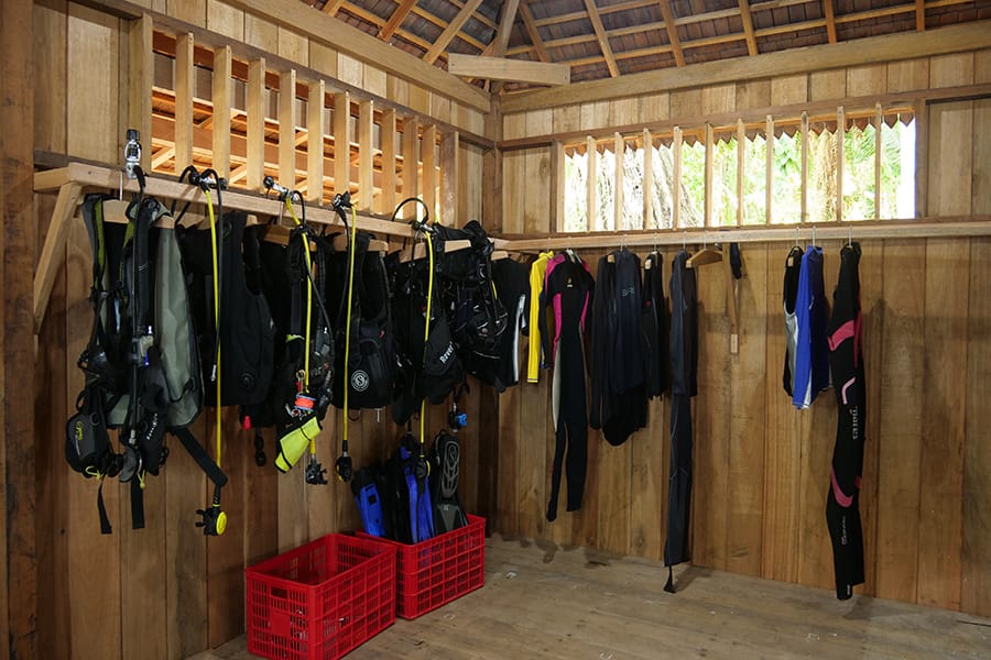 Die eigene Tauchbasis befindet sich direkt im Resort. 12 Liter Alu-Flaschen mit DIN- und INT-Anschlüssen sind vorhanden sowie einige 15 Liter Tanks. Nitrox 32% kann für zertifizierte Nitrox-Taucher dazu gebucht werden. Ein Kameraraum steht für alle Foto- und Videografen zur Verfügung.