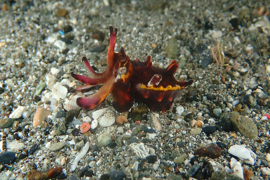 Ambon gehört zu den besten Muck Diving-Destinationen der Welt. Die Bucht von Ambon beherbergt eine gewaltige Vielfalt von Meeresbewohnern wie zum Beispiel den Ambon Skorpionfisch, Rhinopias, Mimik-Oktopusse, Anglerfische, Harlekingarnelen und vielen Seepferdchen und Nacktschnecken.