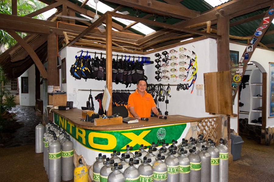 Die eigene Tauchbasis befindet sich direkt im Resort neben dem Restaurant. Hier ist man auf Taucher eingestellt, die viel tauchen möchten. Tauchkurse werden nach PADI-Standards angeboten. 12 Liter Alu-Tauchflaschen mit INT- und DIN-Ventilen sind vorhanden sowie eigene Anlegerboote (Bankas) und Speedboote für die täglichen Ausfahrten. Leihausrüstung sollte vorgängig angemeldet melden. Nitrox ist gegen Aufpreis verfügbar. Ebenfalls wird Fluo-Dive angeboten.