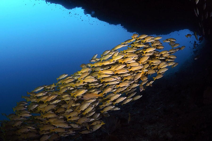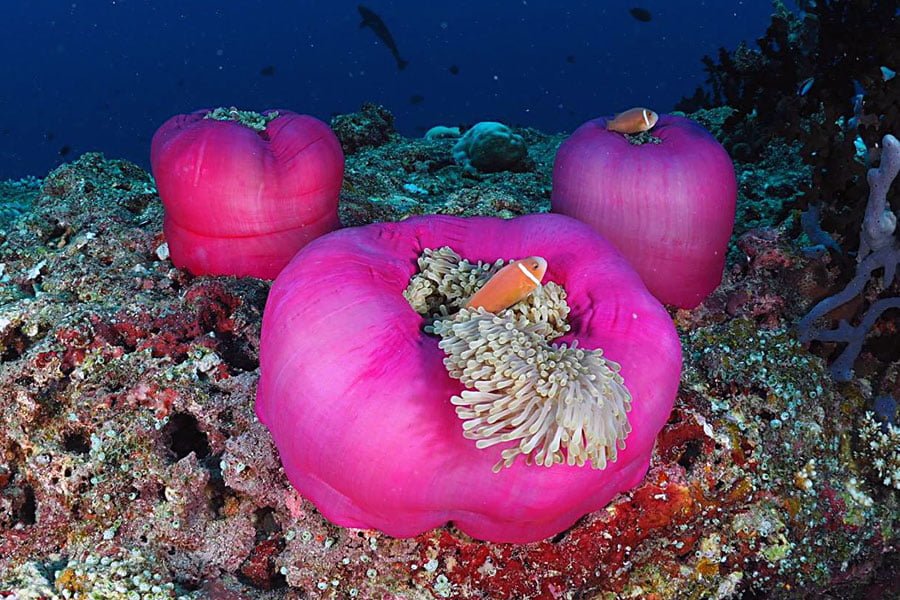 Das Ari Atoll ist eines der Orte mit der grössten Wahrscheinlichkeit auf Grossfische. Vorbeiziehende Walhaie, Hammerhaie und Adler Rochen werden häufig gesehen, sowie grosse Ortsansässige Napoleonfische, Graue Riffhaie und Schwarzspitzenhaie und ausserdem grosse Schulen von Barrakudas und Fledermausfischen. Manta-Saison ist von Juli bis Oktober und von Dezember bis April (ohne Gewähr). Das Hausriff gehört zu den interessantesten des Ari-Atolls. Grossfischbegegnungen sind auch hier sehr gut möglich. Das Riff befindet sich nur 20 Meter vom Strand entfernt und es gibt 10 Einstiegsstellen.