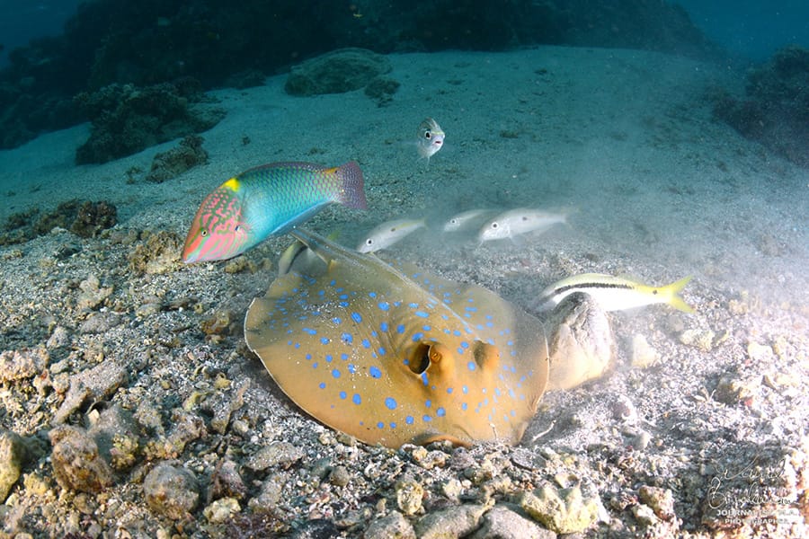 Das farbenfrohe Hausriff ist über zwei Jettys erreichbar, was den Tauchern einen bequemen „one-way“ Tauchgang von einem zum anderen Steg (ca. 400 Meter) ermöglicht. Die etwas erfahreneren Taucher dürfen sich ausserdem auf eine abwechslungsreiche Steilwand freuen, die weit über 50 Meter abfällt. Das noch sehr intakte Riff ist das ganze Jahr über betauchbar und besteht aus Hart- und Weichkorallen, was natürlich zahlreichen Meeresbewohnern einen Lebensraum bietet. Neben den beliebten «Nemos» (Clownfischen) können hier auch grosse Fledermausfische, Flügelrossfische sowie Geisterfetzenfische gesichtet werden. Auch ein Blick ins Blauwasser lohnt sich, denn oft schauen Adlerrochen, Schildkröten oder Napoleons vorbei. Mit etwas Glück sind auch Sichtungen von Delphinen oder einem Walhai möglich. Selbst eine kleine Höhle auf etwa 30 Meter ist vorhanden.
