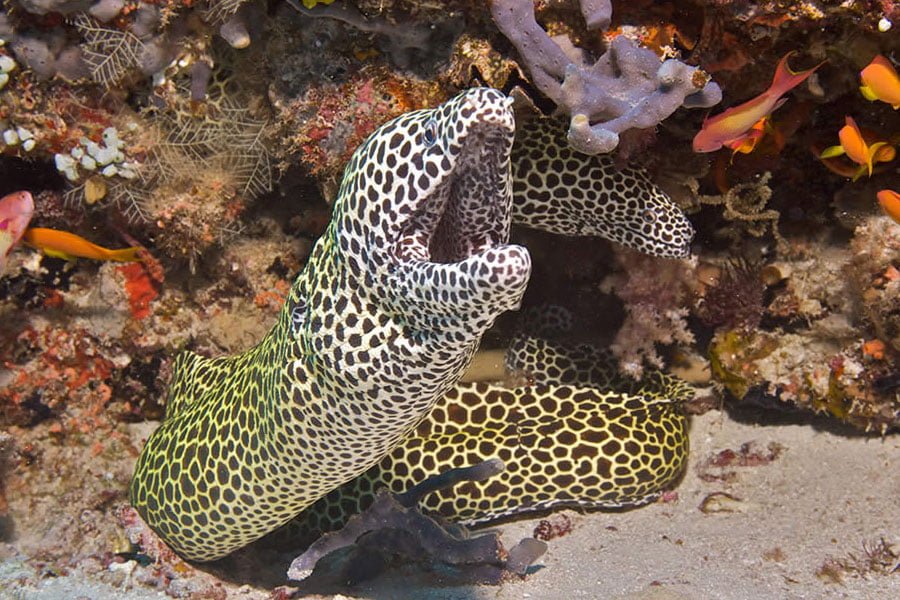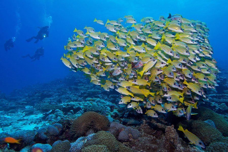 Spannend sind hier vor allem die Steilwände und die Kanäle, in welchen sich viele Haie tummeln. Eine grosse Zahl von Wimpelfischen und Rotzahn Drückerfisch sind ein alltäglicher Anblick und grössere Fische wie Thunfische, Barrakudas und Adlerrochen können oft von Tauchern im Blauen gesehen werden. Das fischreiche Hausriff kann direkt vom Steg aus betaucht werden. In 5 bis 20 Metern tiefe gibt es auch ein Wrack.