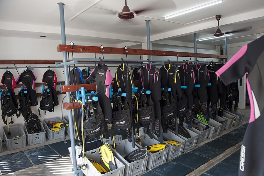 Es werden 3- 4 Tauchgänge pro Tag angeboten.Getaucht wird am Hausriff und auf Bootstauchgängen. Ganztages-Ausflüge werden für Taucher sowie für Schnorchler angeboten. Nachttauchgänge sind unter Voranmeldung möglich. Die rund 40 Tauchplätze sind alle innert 20 bis 45 Minuten, mit den zwei Dhonis, von der Insel erreichbar.