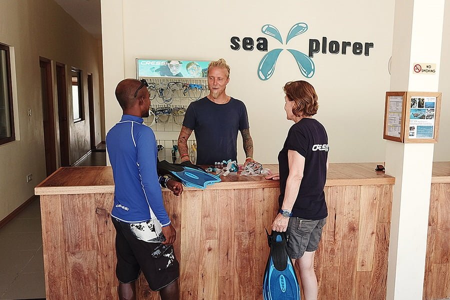 Die von Sea Explorer geleitete Tauchbasis befindet sich auf der Insel Filaidhoo und ist direkt am Reethi Faru Resort angeschlossen. Es wird Deutsch, Englisch und Französisch gesprochen. Neben den täglichen Tauchgängen werden PADI-Tauchkurse vom Open Water Diver bis zum Divemaster angeboten. Die Basis ist gut ausgestattet und auch Leihausrüstung (3-mm-Tauchanzüge) ist vorhanden. 12-Liter-Alu-Flaschen mit DIN- und INT-Anschlüssen sind vorhanden. Nitrox 32% ist für zertifizierte Nitrox-Taucher kostenlos.