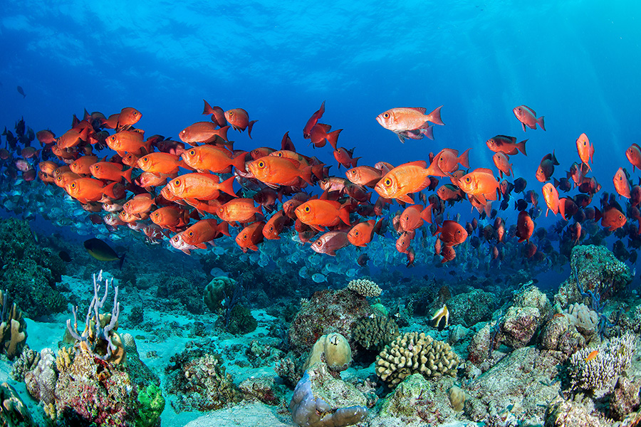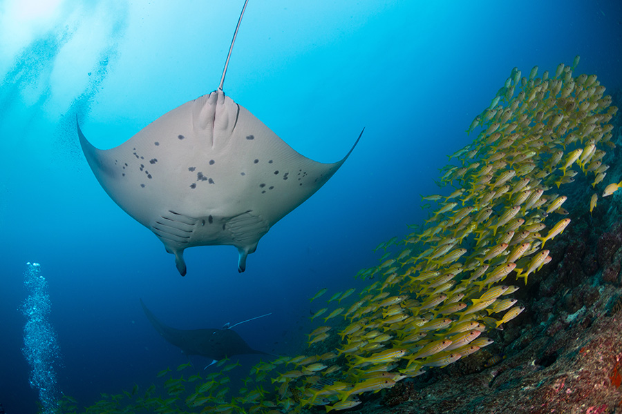Das Hausriff mit 8 Einstiegsstellen befindet sich etwa 30 bis 80 Meter vor der Insel. Besonders im Raa-Atoll besteht das ganze Jahr die Chance Mantas zu sehen. Wie für die Malediven typisch gibt es auch hier viele Strömungstauchgänge in den Kanälen, in welchen die verschiedensten Fische gesichtet werden.