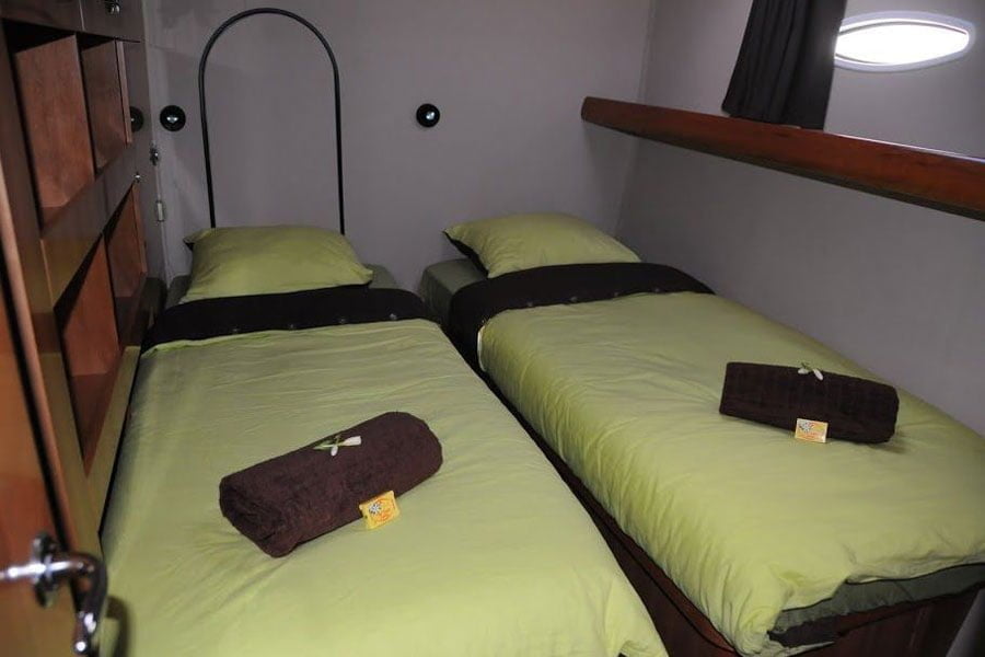 Es stehen 4 Kabinen zur Verfügung. Unterteilt werden die Kabinen in zwei Doppelbettkabinen, eine Zweibettkabine und eine geräumigere VIP-Kabine. Alle Kabinen besitzen ein eigenes Bad/WC, drei Stunden Klimaanlage am Tag und ein HiFi-System.