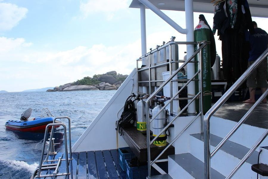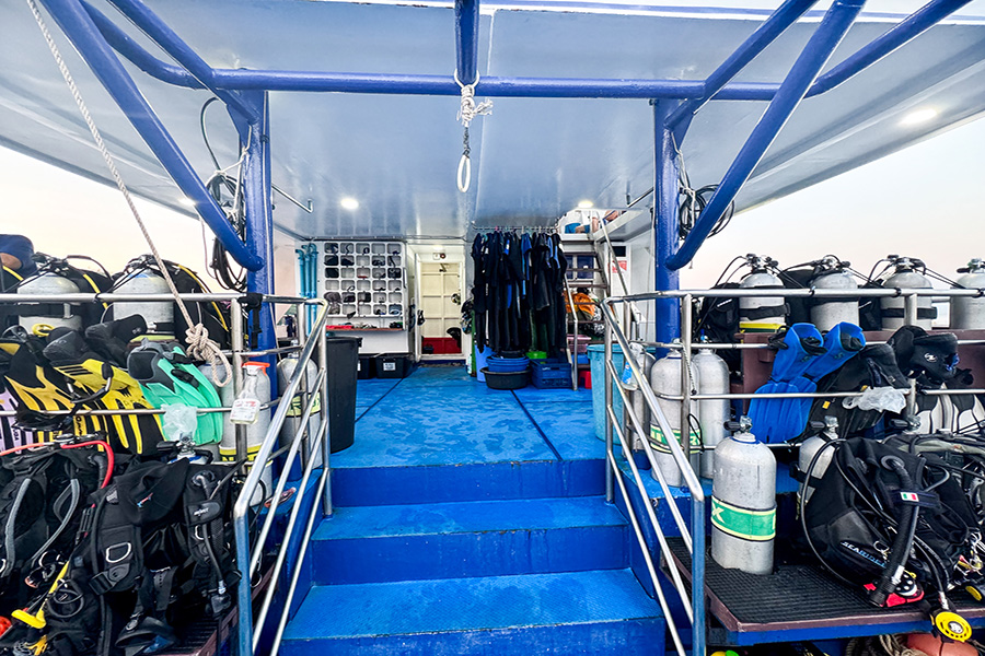 Angeboten werden 3 bis 4 Tauchgänge pro Tag inklusive Nachttauchgang (ausser am An- und Abreisetag). Die Gruppengrösse ist 4 bis 6 Taucher pro Guide und getaucht wird direkt von der Tauchplattform aus. Die Briefings finden in Deutsch oder Englisch statt. Zum Tauchen stehen 12 Liter Aluminiumflaschen mit INT-Anschlüssen zur Verfügung. Nitrox, 15 Liter Tanks wie auch Leihausrüstung sind bei vorgängiger Reservation und gegen Aufpreis vorhanden.