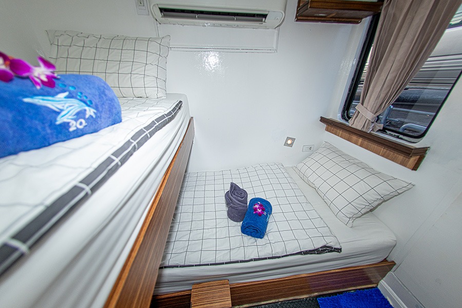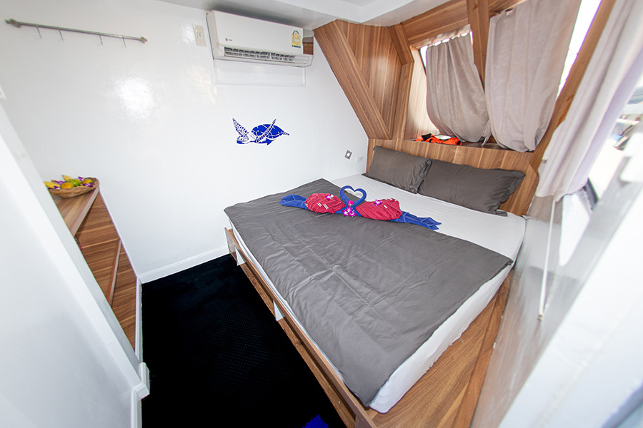 Auf dem Schiff gibt es insgesamt 12 Kabinen, die mit individuell regulierbarer Klimaanlage ausgestattet sind. Auf dem Oberdeck befinden sich zwei Standard Kabinen mit Gemeinschaftsbad/WC. Auf dem Hauptdeck befinden sich sechs Comfort Kabinen mit eigenem Bad/WC und auf dem Oberdeck zwei weitere Comfort Kabinen und zwei Deluxe Kabinen jeweils mit eigenem Bad/WC.