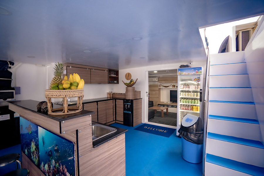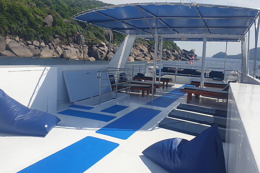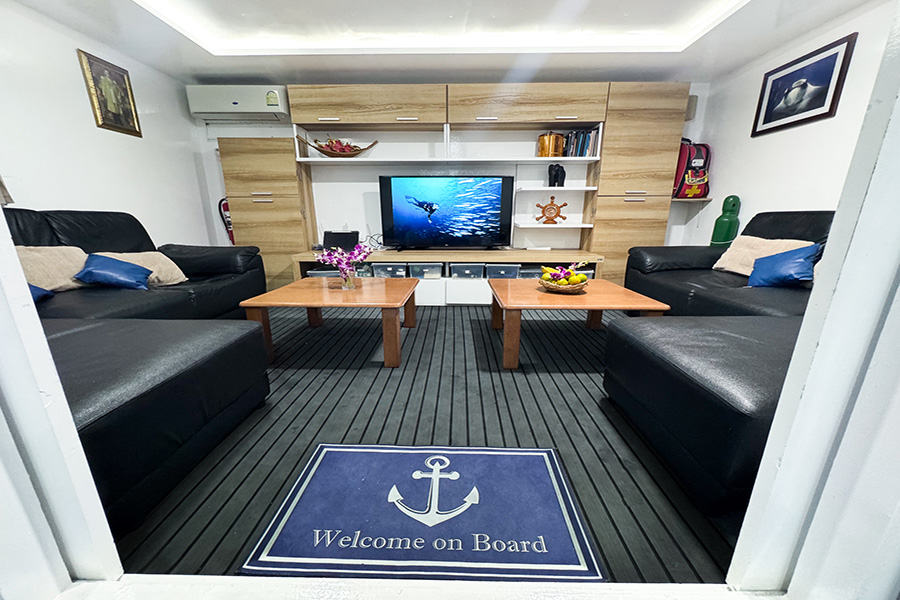 Die hauptsächlich thailändischen Mahlzeiten werden auf dem überdachten Aussenbereich des Hauptdeckes in Buffetform serviert. Im Innenbereich gibt es einen Salon mit Sofas und einer Multimedia-Ecke. Das Sonnendeck bietet Liegen und Matten und auf dem grossen Tauchdeck findet jeder Taucher genügend Platz. WLAN ist kostenlos verfügbar.