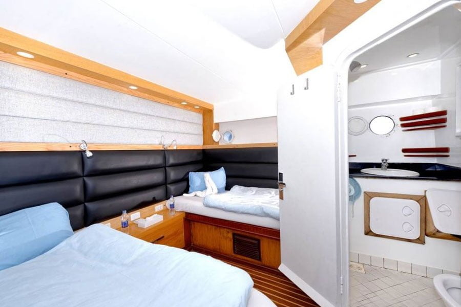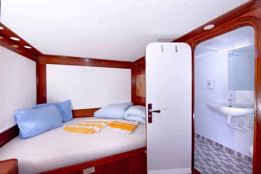 Die Blue Pearl bietet Platz in 10 geräumigen Kabinen. Acht Kabinen mit zwei einzelnen Betten befinden sich im Unterdeck und zwei Kabinen mit einem Doppelbett auf dem Oberdeck. Alle Kabinen verfügen über eine individuell regulierbare Klimaanlage und eine eigene Dusche/WC.