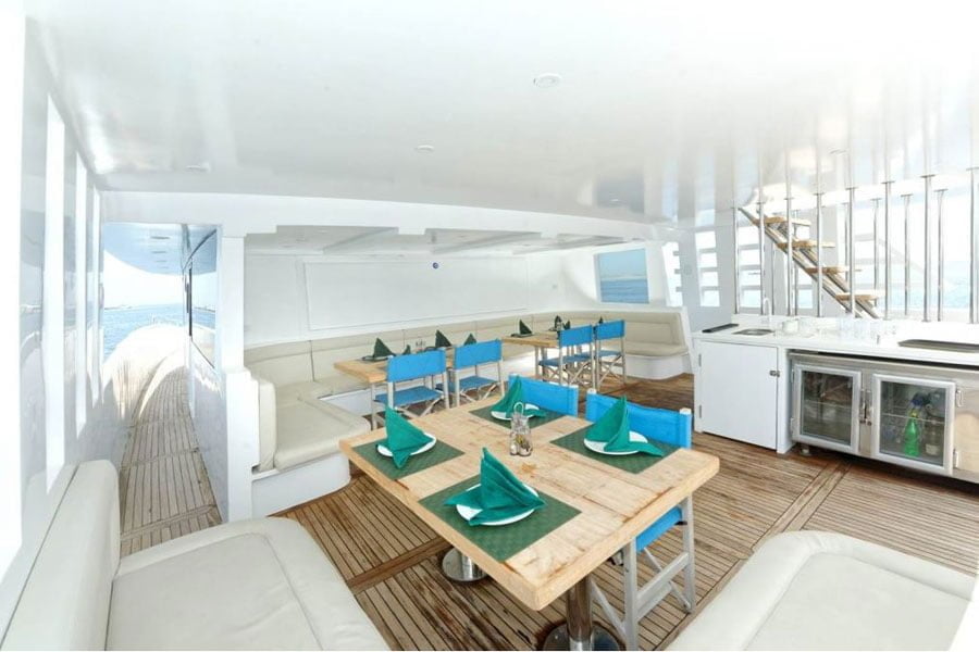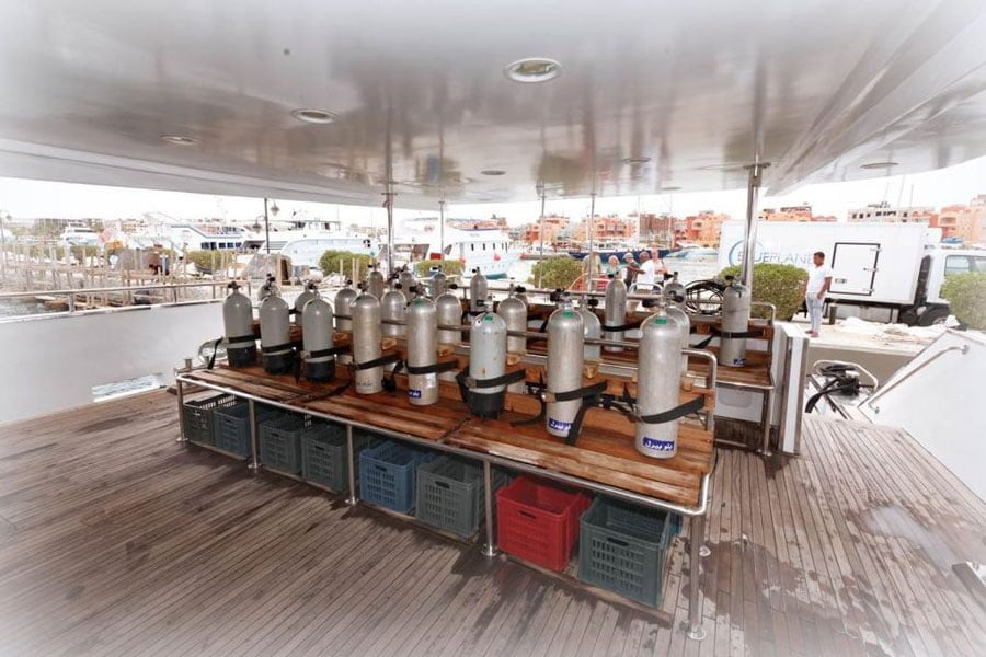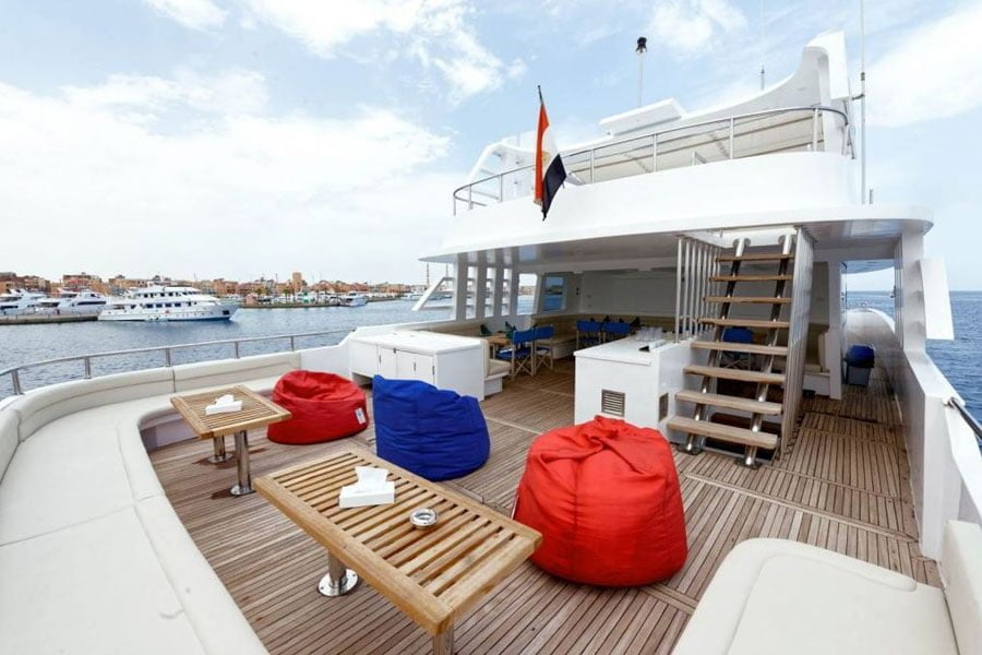 Das Schiff bietet einen komfortablen Wohn- und Essbereich mit TV/DVD und CD Player. Die überwiegend europäischen und arabischen Spezialitäten werden in Buffetform serviert. Zudem gibt es zwei geräumige Sonnendecks welche teilweise schattig gepolstert sind. Zwei Treppen führen zu einer grossen Tauchplattform mit einer Akku-Ladestation und Kameratisch.