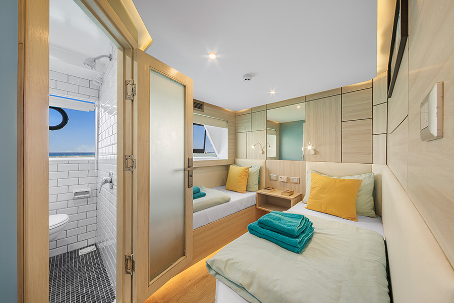 Das Schiff bietet 12 Kabinen, alle sind ausgestattet mit individuell regulierbarer Klimaanlage und eigenem Bad/WC. Acht Zweibettkabinen befindet sich im Unterdeck und eine auf dem Oberdeck. Zusätzlich gibt es drei Doppelbettkabinen auf dem Oberdeck.