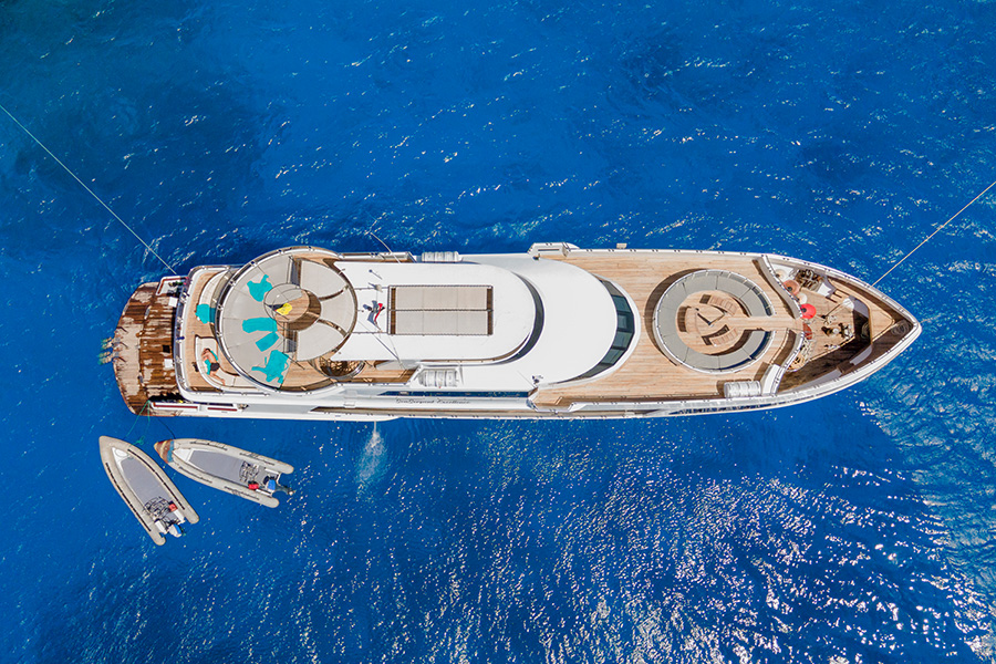 Der Salon bietet neben TV/DVD- und Audiosystem auch eine Bar sowie einen separaten Essbereich. Es werden 3 Mahlzeiten in Buffetform serviert, überwiegend europäische und arabische Spezialitäten. Zudem gibt es zwei teilweise überdachte Sonnendecks und ein grosses Tauchdeck.
