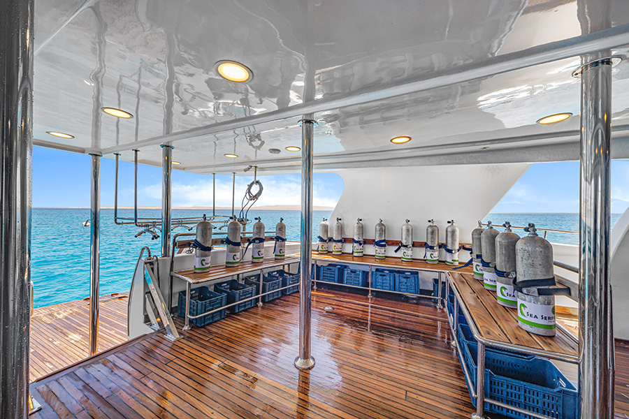 Es werden täglich 3 bis 4 Tauchgänge angeboten (ausser am An- und Abreisetag). Diese finden vorwiegend von einem der Beiboote aus statt. Deutschsprachige Tauchguides sind auf Wunsch bei Anmeldung mit an Bord. Da selbstständiges Tauchen im Buddy-Team vorausgesetzt wird, ist eine gewisse Taucherfahrung für die Teilnahme an den Safaris Voraussetzung. Es stehen 12 Liter Aluminiumtanks mit DIN- oder INT-Anschlüssen zur Verfügung. Gegen Aufpreis und Voranmeldung können Leihausrüstung und 15 Liter Tanks organisiert werden. Nitrox 32% ist für zertifizierte Taucher kostenlos. Das Schiff ist mit dem ENOS-Rettungssystem ausgestattet.