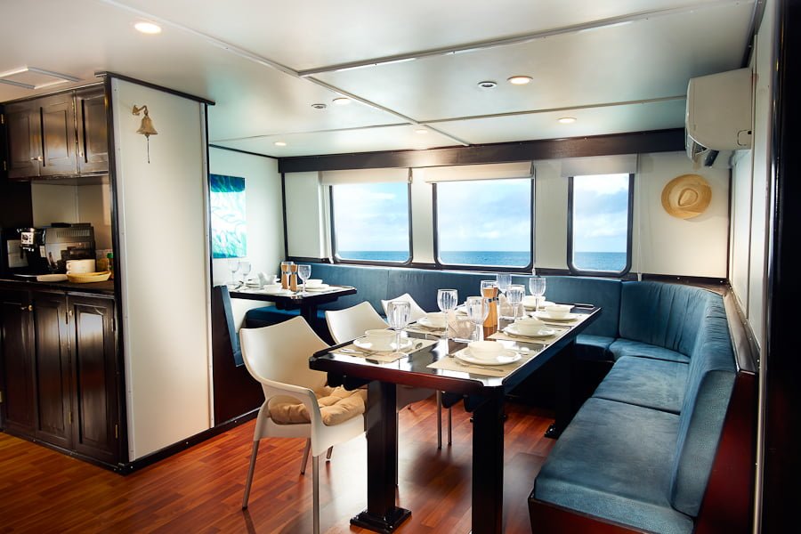 Die Galapagos Master besitzt ein Restaurant mit einer Bar und eine Lounge. Hier stehen den Gästen eine Multimedia-Ecke mit TV/DVD und eine Musikanlage sowie eine Bibliothek zur Verfügung. Mahlzeiten werden als Buffet serviert. Es gibt ebenfalls ein Sonnendeck mit Liegen sowie ein grosses Tauchdeck. Sowohl im Aussen- als auch im Innenbereich können die Gäste Extra-Flächen für ihre Kameras finden.
