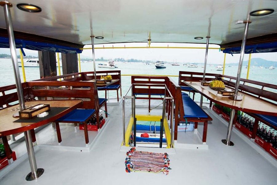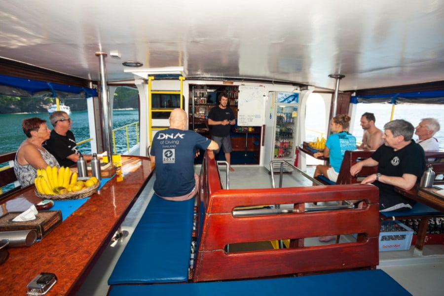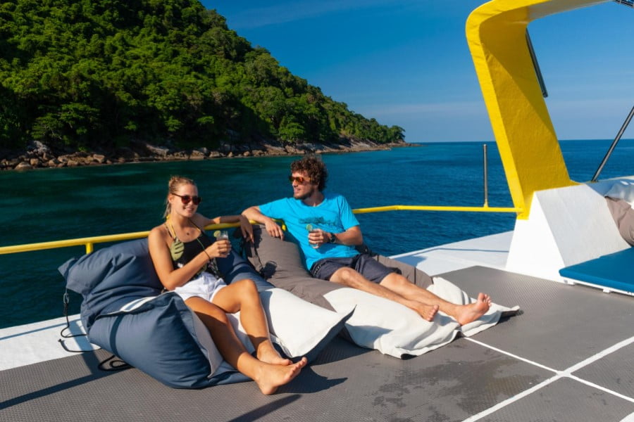 Das Partydeck umfasst Salon, mit TV/DVD, Stereoanlage, Sitzgelegenheiten und einen offenen Heckbereich. Die Bordküche bereitet frische Gerichte aus der Thai-Küche zu. Das Sonnendeck eignet sich zum Entspannen und Sonnenbaden. Das grosse und überdachte Tauchdeck bietet mehr als genügend Platz für die Tauchausrüstung. Zwei breite Treppen führen auf die Tauchplattform und garantieren so einen bequemen Ein- und Ausstieg aus dem Wasser.