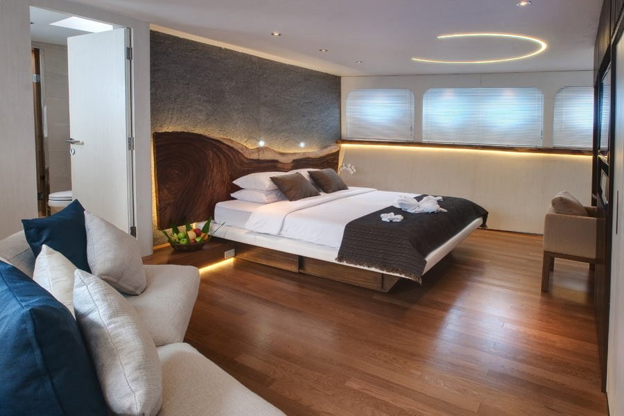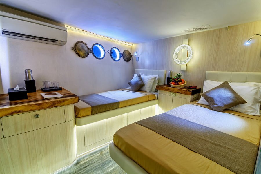 Auf der Pelagian stehen 5 Kabinen mit individuell regulierbarer Klimaanlage und eigenem Bad/WC zur Verfügung. Die Standard Kabine (Nr. 6) sowie die Deluxe Kabine (Nr. 2) sind mit zwei Einzelbetten ausgestattet. Die Superluxe Kabinen (Nr. 3 & 5) sind mit einem Doppelbett und einem Einzelbett ausgestattet. Die Master Kabine (Nr. 1) ist mit einem grossen Doppelbett ausgestattet.