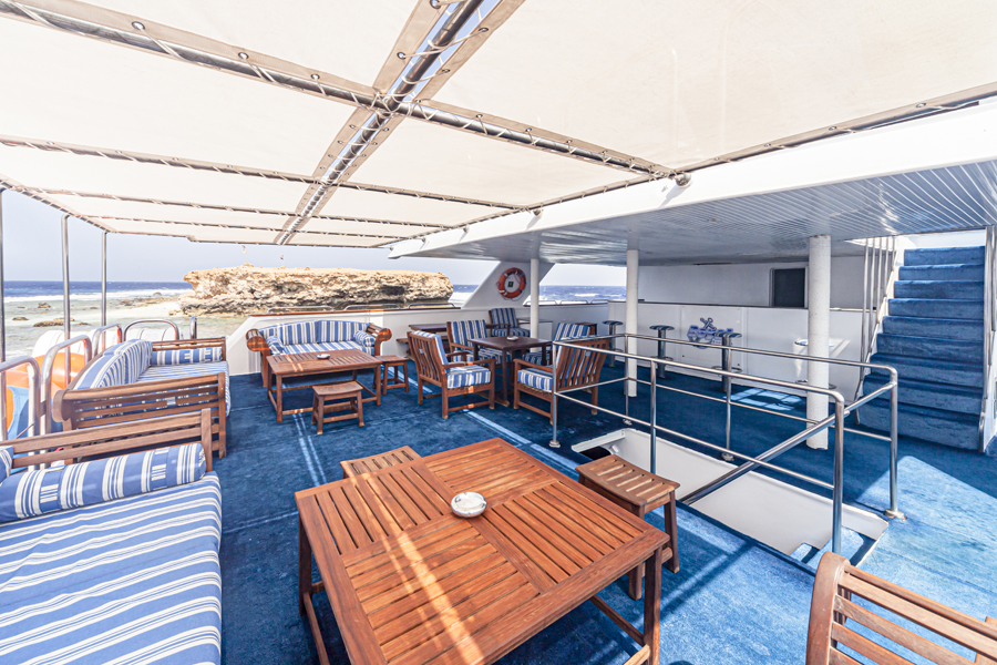 Der Salon hat ausreichend Sitzmöglichkeiten. Hier befindet sich eine Bar, eine TV/DVD-Kombination und eine kleine Bibliothek. Im Restaurant werden die einheimischen und europäischen Mahlzeiten als Buffet serviert. Im Aussenbereich gibt es Sitz- und Liegemöglichkeiten, eine Bar und einen Whirlpool. Ebenfalls bietet das Schiff ein grosses Tauchdeck.