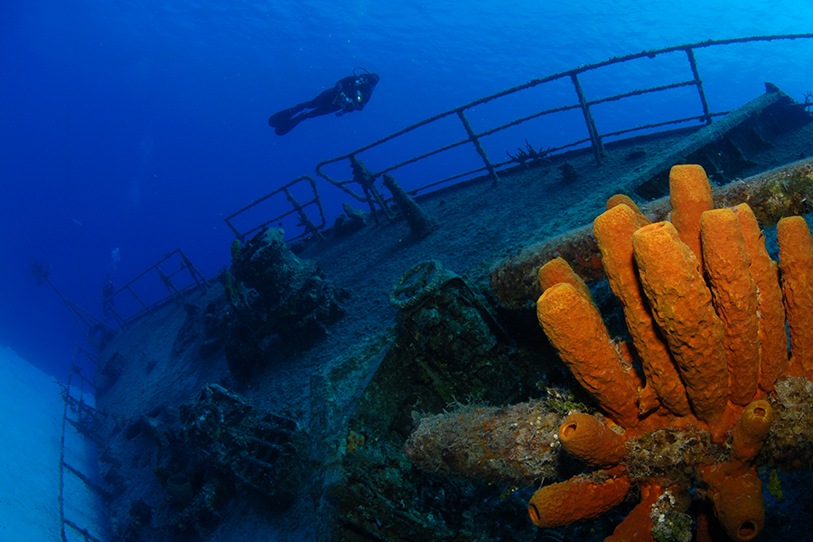 Die Cayman Islands bieten einige der schönsten Wracks der Karibik – weniger in Zahl, dafür umso spektakulärer. Besonders bekannt ist die USS Kittiwake, ein ehemaliges Bergungsschiff, das gezielt versenkt wurde und heute in klarem, türkisfarbenem Wasser ruht.